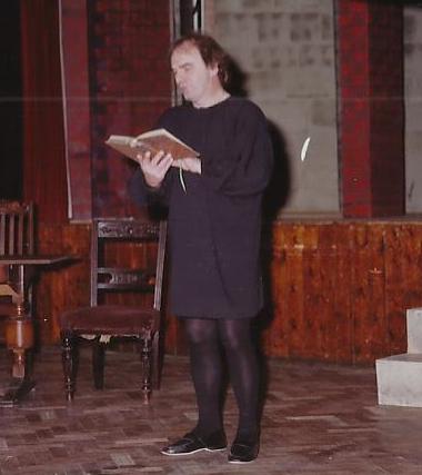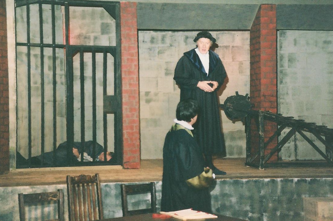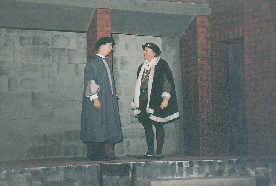 All of these characters were clearly drawn, but the characterisations throughout were a little too subtle. The contrasts which are essential for really powerful drama came in the characters of the women. Mary Warrington gave a passionate portrayal of More’s wife, desperately pleading, desperate to understand the intransigence, and Tracey Brett as Meg, More’s daughter, showed her intelligence and wit, as in the delightful Latin exchange with the young King. Dave Hawkins brought a lot of energy, and sympathy, to this part. Leading us through the drama as the Common Man was Nick Roberts, splendid in all his guises.