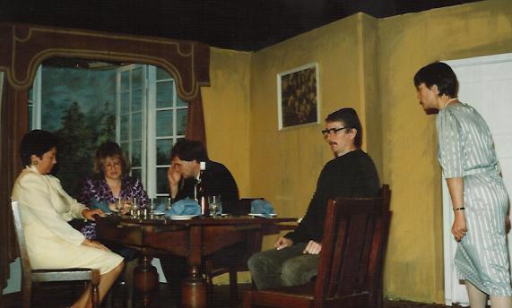 Dave Hawkins’* dry sarcastic delivery was just right for his portrayal of Reg and Mary Warrington’s Ruth Excellent as the “understanding” wife. Brenda Prior’s Annie lacked a little at times but came good when the occasion demanded especially in the dinner scene when referring to the amorphous dish she had concocted as “oxtail soup with unidentified lumps!”