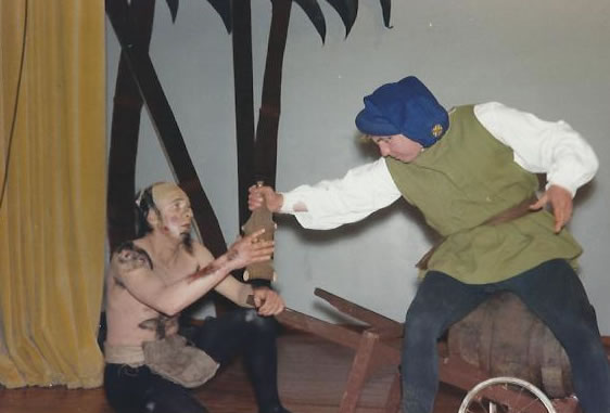 Two more outstanding performances were those given by Nigel Carine as Ariel and Brian Walton as Stephano, a drunken butler. Whether or not his daily occupation as the local landlord gave him a greater insight into the part we shall never know, but he was magnificent. David Bungard as Trinculo was amusing too, and he and Stephano could always be counted on to liven up proceedings if ever the play began to lag a little. They made good contrast to the rather staid (although colourful costume-wise) selection of Lords, none of whom was particularly outstanding although P Monger as Gonzalo, the honest old councillor, was probably the best. Others were R Stanlake, T Stephens, C Baigent and P Palfrey.