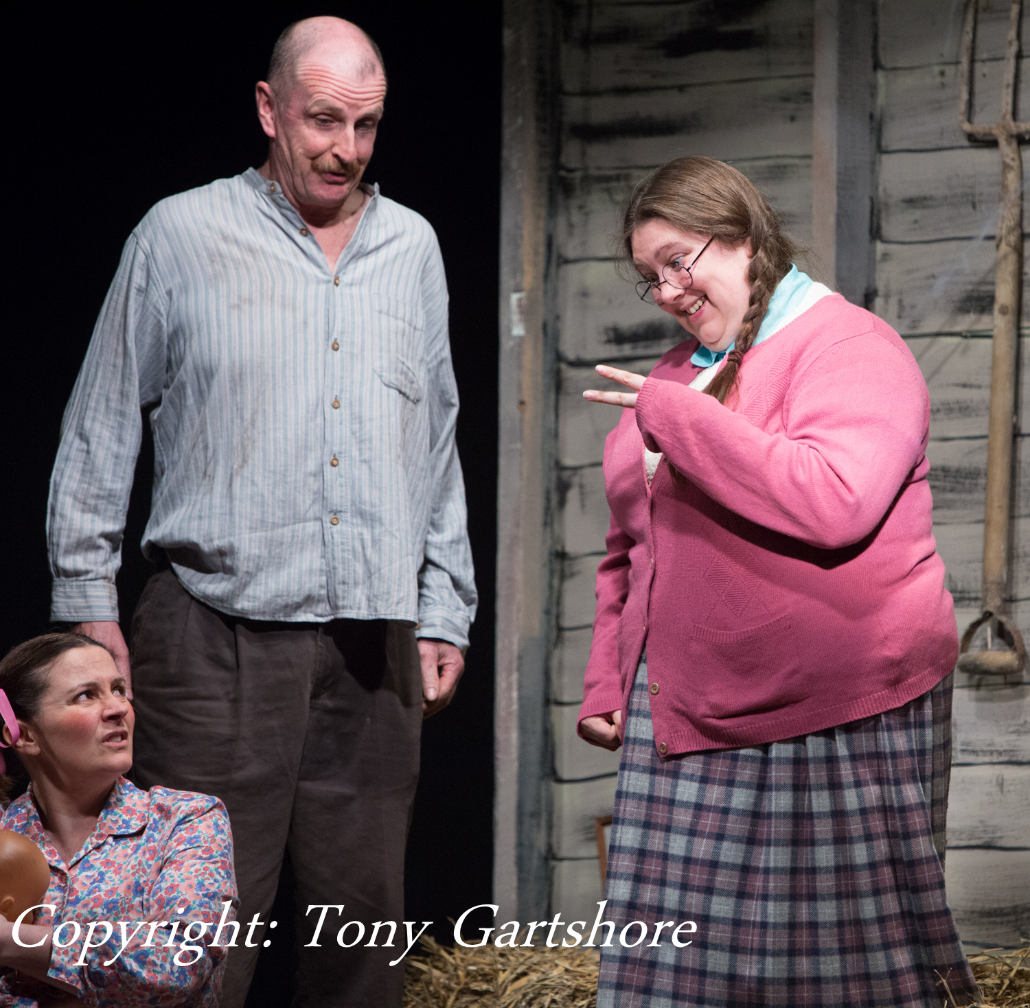 Compton Players took on this challenge and exceeded expectations. Upon arrival, the set was in-the-round with carpets strewn across the floor to mimic rolling fields. A tree doubled as a climbing frame ensured actors could make quirky entrances and Donald Duck’s infamous shed was impressively constructed on stage with excellent special effects and lighting for the fatal fire (Paul Shave).