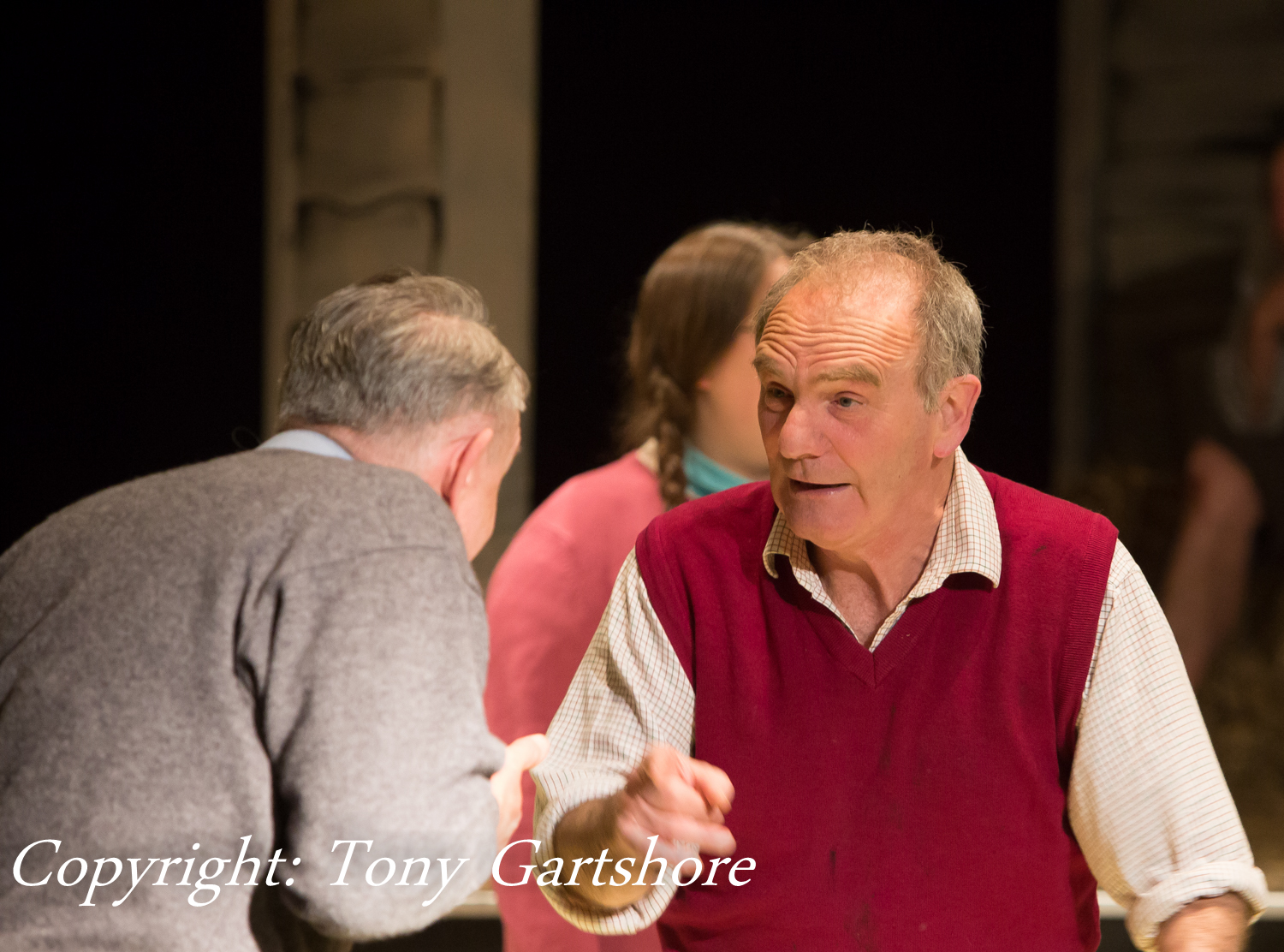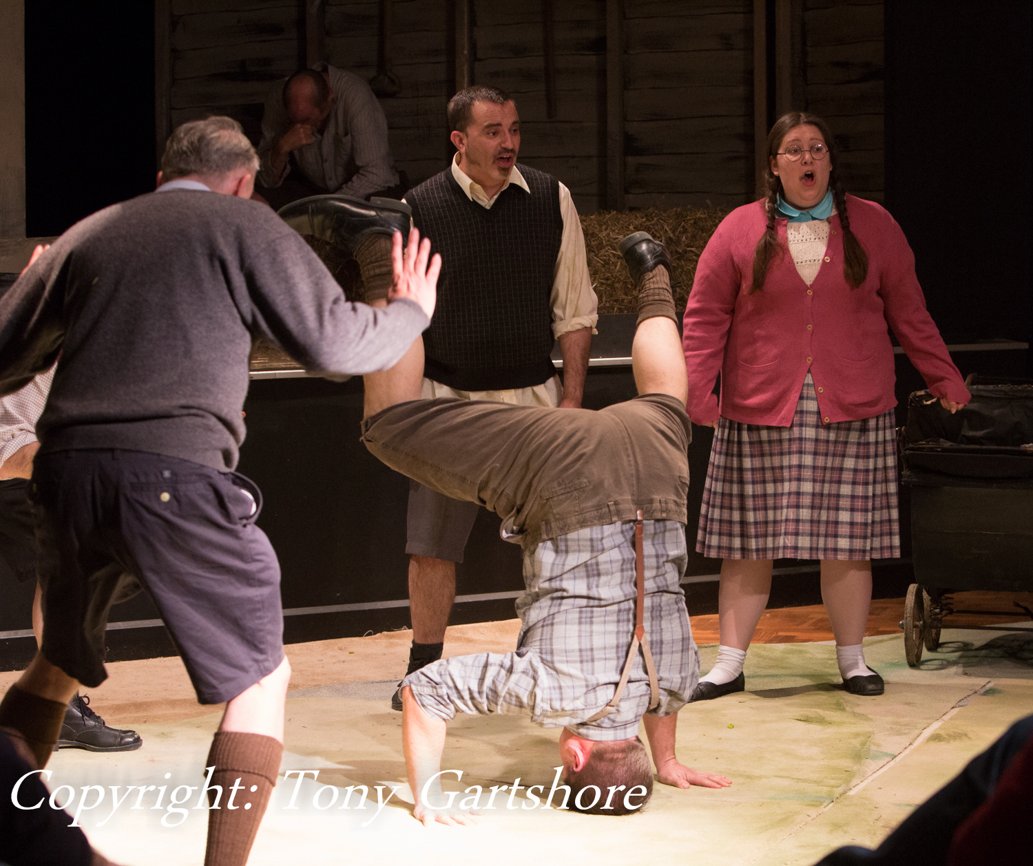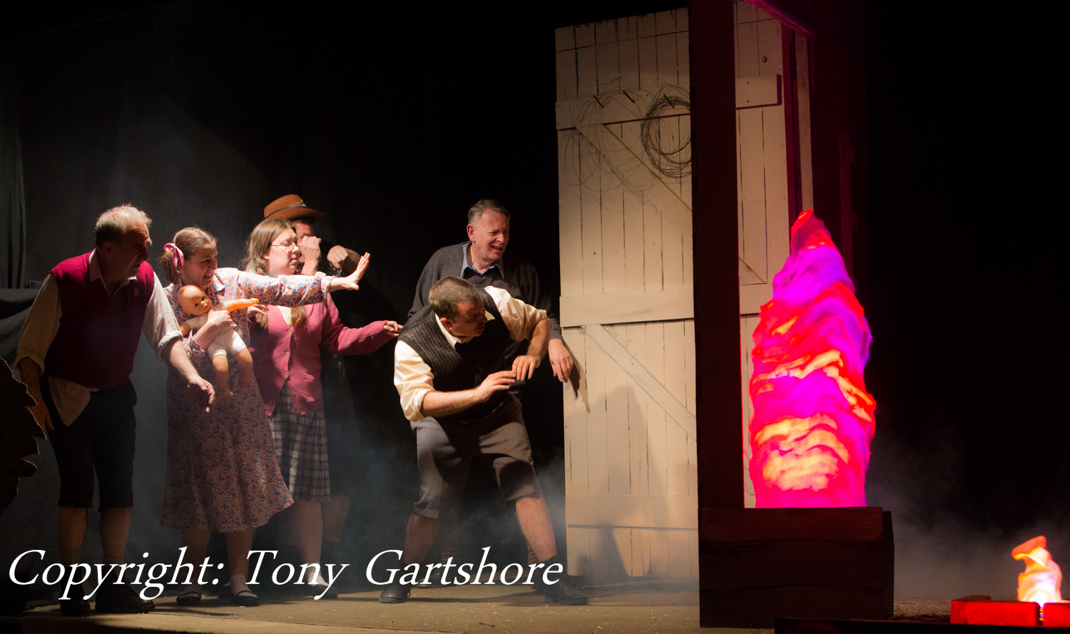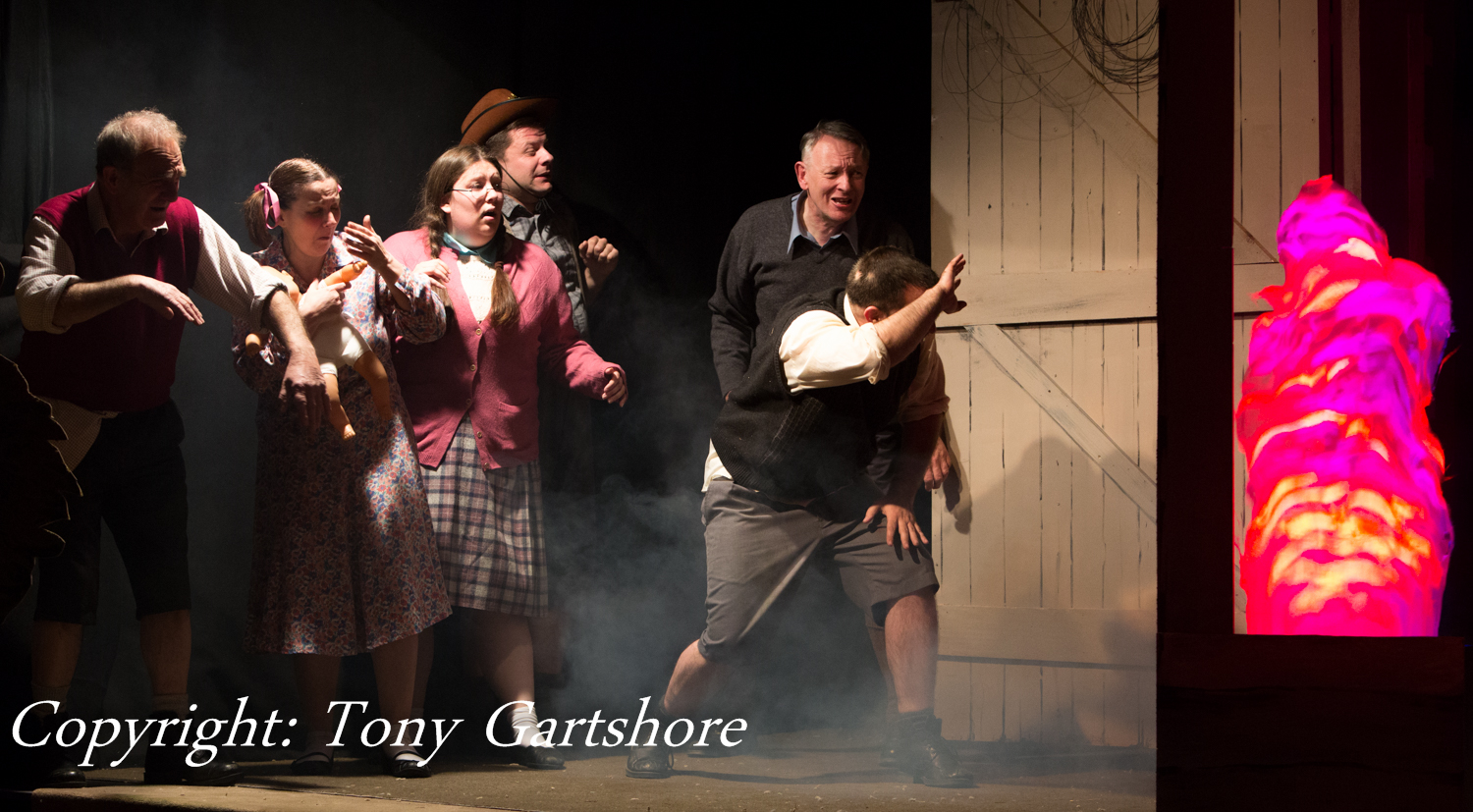 I had doubts about this play, when I heard that it was adults playing 7 year olds, but those doubts quickly evaporated when the play got underway. The cast skilfully portrayed the group of children and we became convinced with their characters. Accents were good and maintained throughout, giving emphasis to the childhood humour. Willie (Nick Roberts) displaying the childlike traits of awkward hand gestures and fiddling with his clothing was a good start, closely followed by Peter (Pete Watts) the local bully, who, typically, resorted to cowardice when bullying did not work after his fight with John (Dave Hawkins). John was the more serious member of the group and challenges the cheating Peter, whilst being protective of the stammering Raymond (Phil Prior). Raymond was played sympathetically for his slight affliction and perceived immaturity compared to the rest of the group.Angela (Tracey Pearce) and her friend Audrey (Jasmine Gartshore) befriend the lonely and mocked Donald (H Connolly) in the barn, where he eventually meets his demise. Donald is desperately unhappy because his father is a Japanese prisoner of war. He seeks solace in the company of the girls rather than being accepted as part of the boy’s gang. Donald’s solitary playing with matches, which result in the fire was very poignant and the fire scene was very effective. This could have been enhanced if the fire effect had been maintained, even though the action had moved to the round, where recriminations and excuses were being explored. This would emphasise the seriousness and ongoing nature of the disaster.