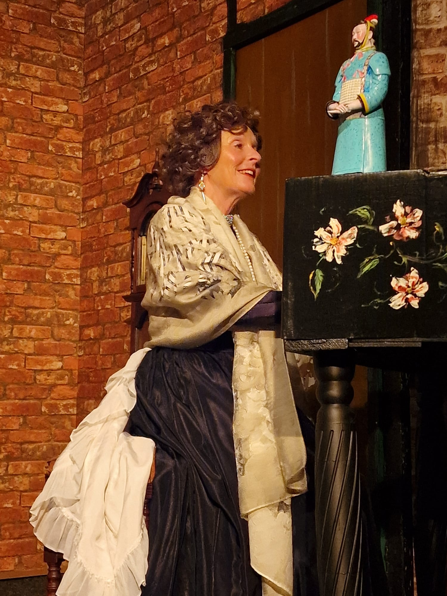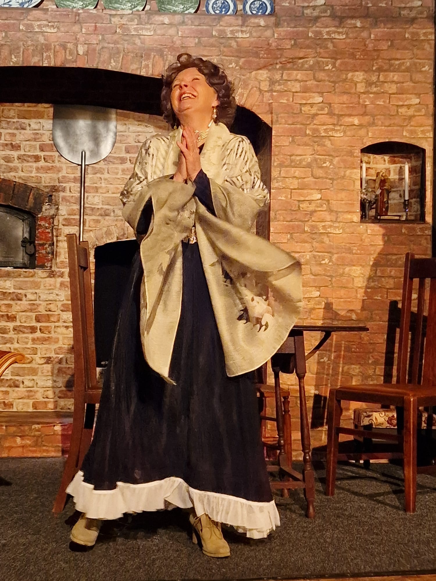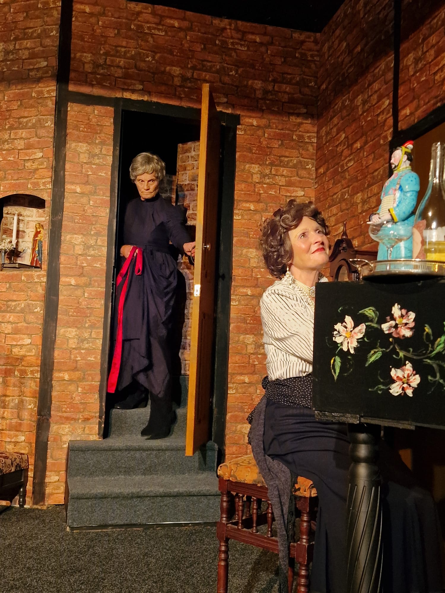The costumes were excellent and in keeping with the period. Ellen in plain black Victorian dress, Lucy’s maid’s outfit (with white apron and mop cap) went well with her flowery dress. Leonora’s artistic temperment was emphasised with her flamboyant outfits with their frills, lace and bright oriental style dressing gown. The sisters had more basic dresses and bonnets. Albert, the only male in the cast, had a smart suit. Sound and lighting: The sound was very good with effects such as the storm (dipping and raising when the door was opened and closed), carriages and piano all done effectively. The lighting too was well orgnaised with there being lights at the apprpriate times when doors were opened/closed and to indicate the passage of time.