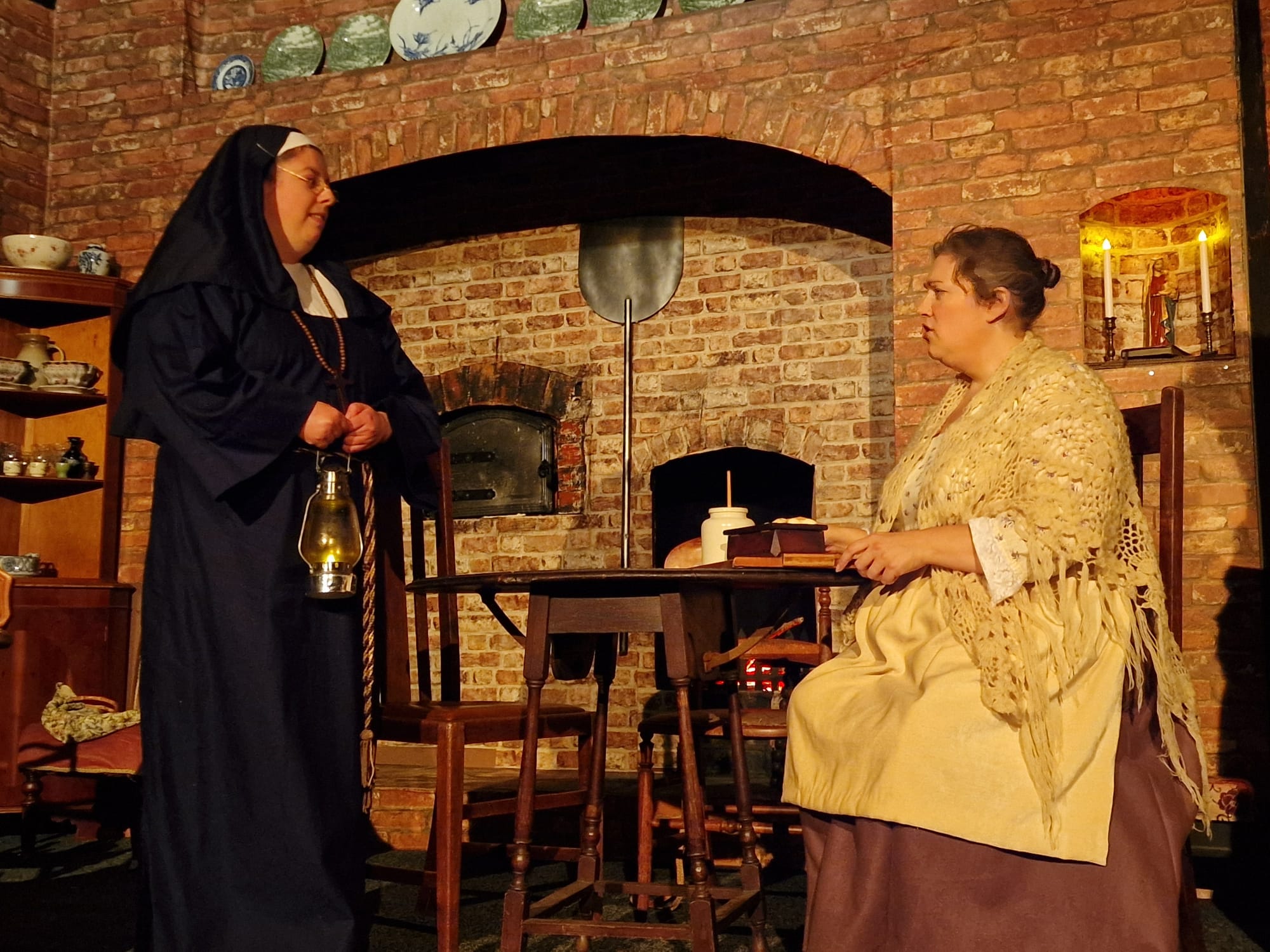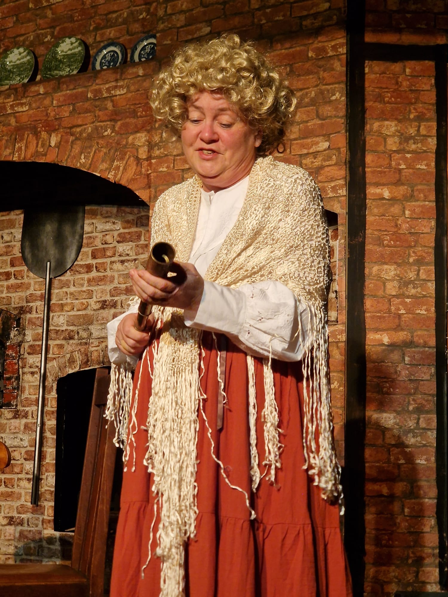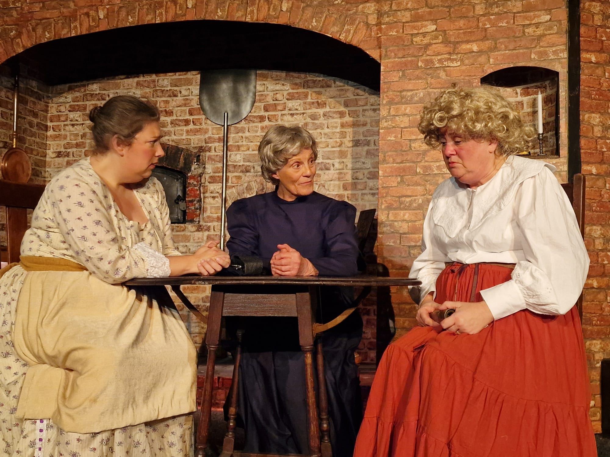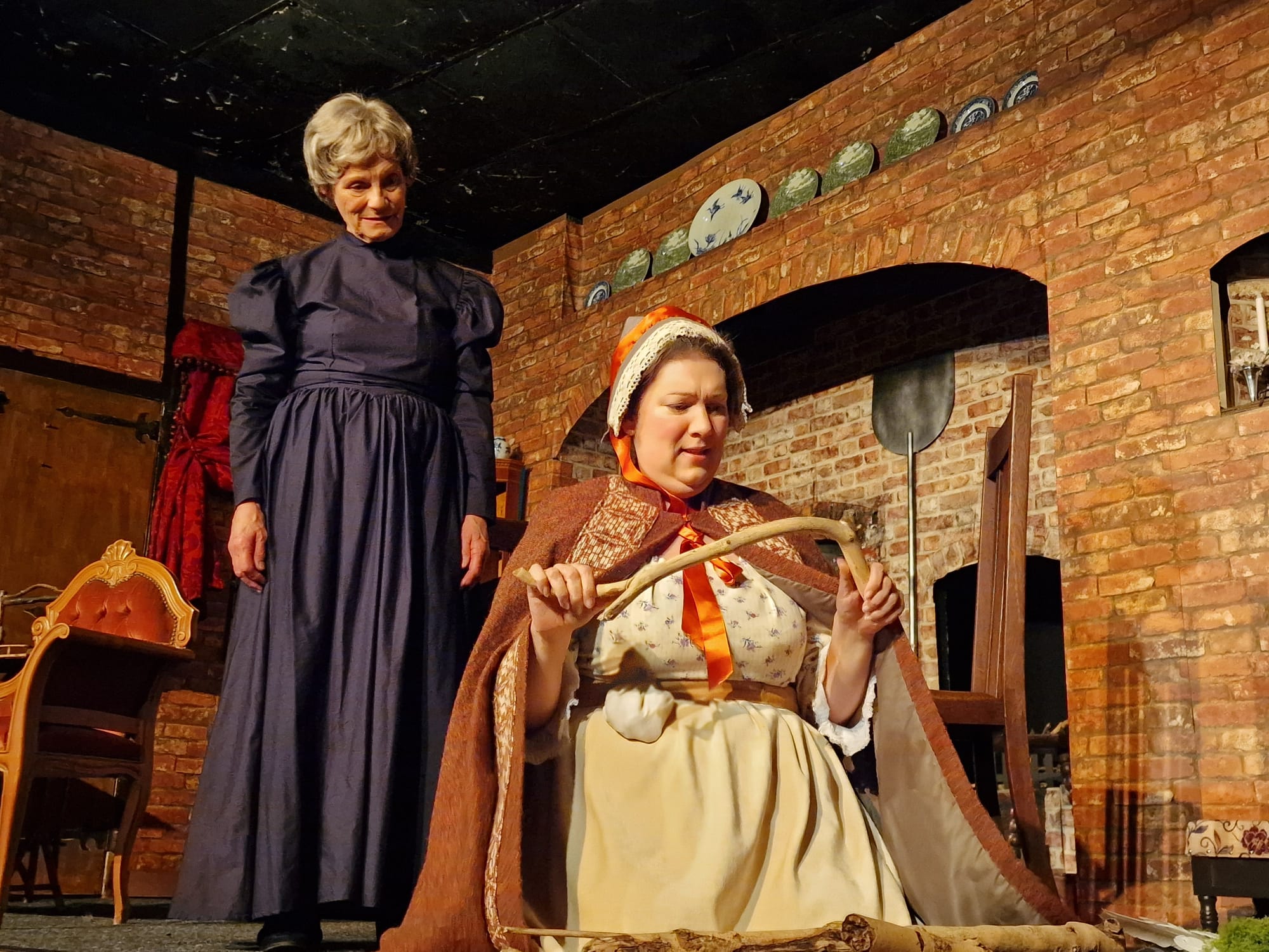 The set was absolutely brilliant and – as far as I could see – historically accurate with brickwork, beams, wooden doors, large fireplace and bake oven (central to the plot). It was well laid out and made maximum use of the small stage. The props were well sourced and used and included telescope, oil lamps, firewood, grandfather clock and copper pan.