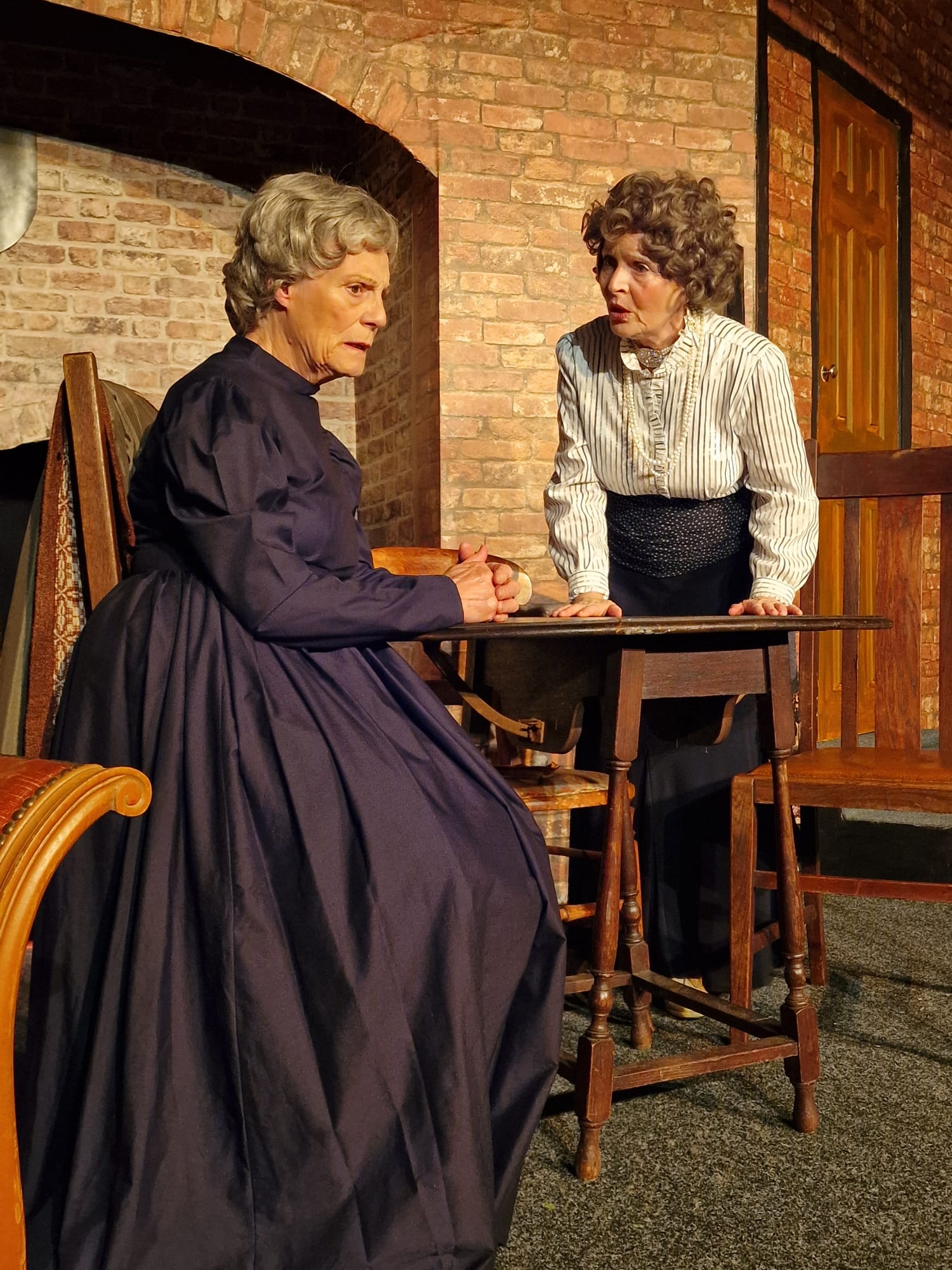 Based on a famous murder in the late 19th century, the play is set in a remote, lonely house on the marshes of the Thames estuary which is owned by former actress Leonora Fiske – a very strong performance from Ann Griffiths, confident and authoritative. Also living there are her companion Ellen Creed (Liz Saxton who also played Ellen in the 1973 production) and her maid Lucy (Helen Saxton). Ellen’s two younger sisters Louisa and Emily with learning difficulties are also staying there on holiday, but maybe moving in permanently; Leonora strongly opposes this, leading to conflict between her and Ellen. The group worked extremely well together, with fine acting and each with distinctive characteristics which distinguished them well – Ellen severe and confident, Louisa (Lynne Buckland) childlike, chatty and indiscreet and Emily (Jasmine Mullany) more subdued and thoughtful.